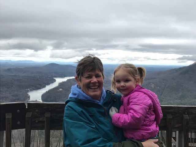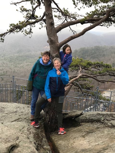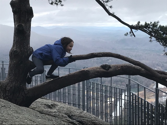 Watching a granddaughter climb a tree at the top of the rock and holding another in the wind.