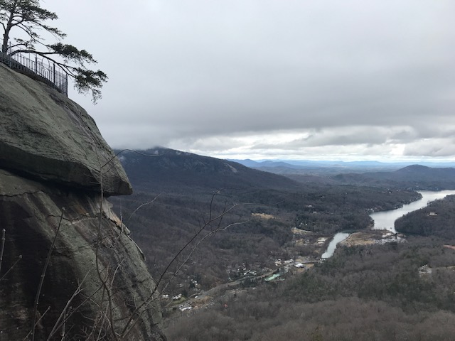 The view…mountains, Lake Lure below, rivers winding through rocky valleys.